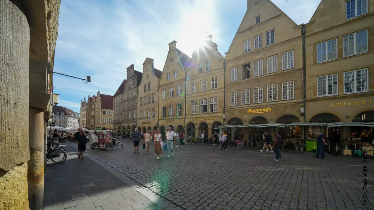 Gleich zu Beginn stehen einige der bekanntesten Häuser von Münster auf engem Raum: